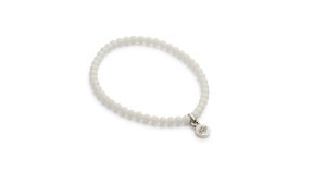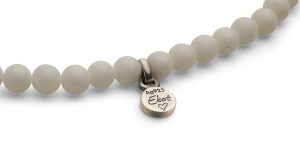 Das Armband besteht aus weißen Jade Edelsteinen mit einem Durchmesser von 4 mm und hat einen 7 mm Anhänger aus 925 Sterlingsilber mit der Ekats Signatur auf der einen Seite und einem Motiv auf der anderen Seite. Das Armband wird auf einem doppelten Silikonband aufgefädelt und kann damit problemlos an und ausgezogen werden und ist sehr angenehm zu tragen.