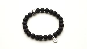 Das Armband besteht aus matt schwarzen Lavasteinen mit einem Durchmesser von 8 mm und hat einen 7 mm Anhänger aus 925 Sterlingsilber mit Ekats Signatur. Auf der Vorderseite des Armbands ist eine 10 mm Kugel aus Sterling Silber mit 2 kleinen Totenköpfen. Das Armband wird auf einem doppelten Silikonband aufgefädelt und kann damit problemlos an und ausgezogen werden und ist sehr angenehm zu tragen.