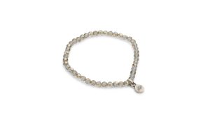 Das Armband besteht aus glänzenden grauen Kristallen die einen Facettenschliff haben, mit einem Durchmesser von 4 mm. Das Armband hat einen 7 mm Anhänger aus 925 Sterlingsilber mit der Ekats Signatur auf der einer Seite. Das Armband wird auf einem doppelten Silikonband aufgefädelt und kann damit problemlos an und ausgezogen werden und ist sehr angenehm zu tragen.