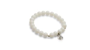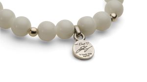 Das Armband besteht aus weißen Jade Edelsteinen mit einem Durchmesser von 8 mm, hat einen 9 mm Anhänger aus 925 Sterlingsilber mit der Ekats Signatur auf der einen Seite und ihrer kleinen Katze auf der anderen Seite und zwei kleinen Silberkugeln als Trenner. Das Armband wird auf einem doppelten Silikonband aufgefädelt und kann damit problemlos an und ausgezogen werden und ist sehr angenehm zu tragen.